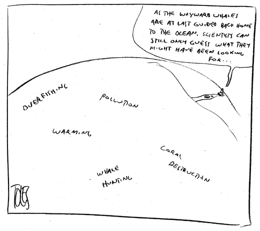 Remarkably, our most enviro of editorial cartoonists, Tom Toles, foresaw the gist of this story back in May, when he published a sketch for a possible cartoon about the two wayward humpback whales who briefly went up the Sacramento River.