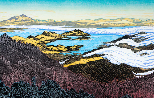 It’s been just insanely hot here in SoCal: 108 yesterday in Ojai. It’s times like this that I miss the fogs of the Bay Area, which sooner or later would always come in…the woodcut artist Tom Killion, who grew up in my neck of the woods, knows how to portray the wonders of that oceanic substance as it pours in, here seen from West Point on Mt. Tamalpais.