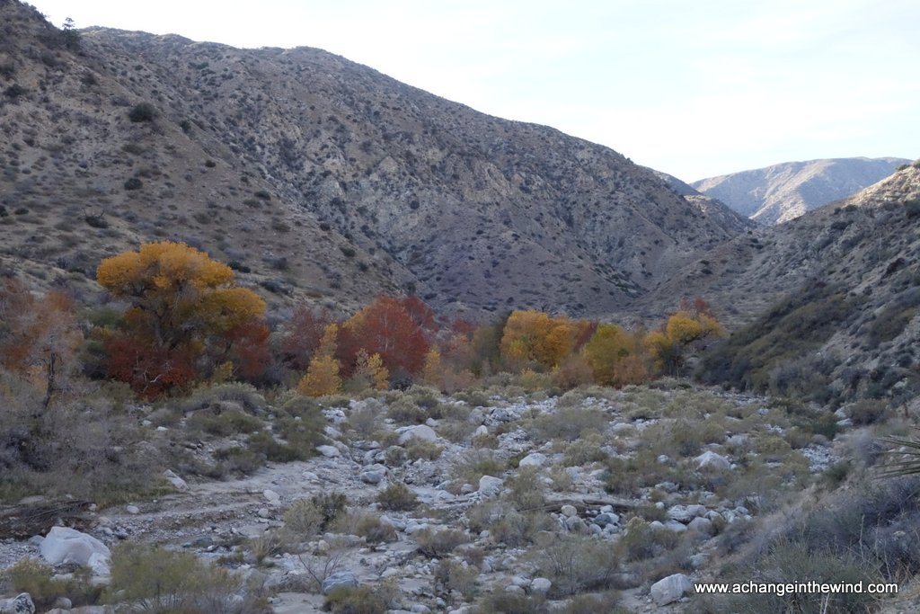 Trail passed over a ridge or two and then came down into the Mission Creek streambed, and picked up some fall colors — for about the next twenty miles. Incongruous but appealing.