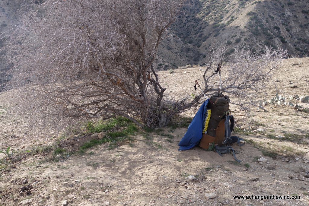Enjoyed camping in the leafy colors, despite the coldness and the emptiness, but next day the trail turned away from the creek and headed up the ridge towards the mountains — 5000+ in a day — into an increasingly barren landscape, interrupted occasionally by shrubbery. Left the San Gorgonio Wilderness reluctantly. True wilderness in my experience usually has a kind of wholeness, where BLM or Forest Service land may not.