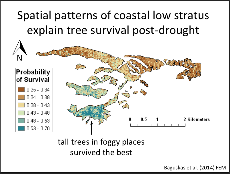 “These low clouds are really important regulators of drought at the Earth’s surface,” he said. “For people, it’s not such a big deal [because they have alternate water sources], but for ecosystems the fog water is all they’ve got during summer.”