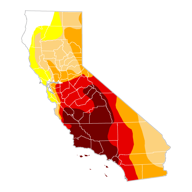 Chart goes from “abnorally dry” (yellow) to “exceptional drought” (brown). Red is “extreme drought,” the second worst category.