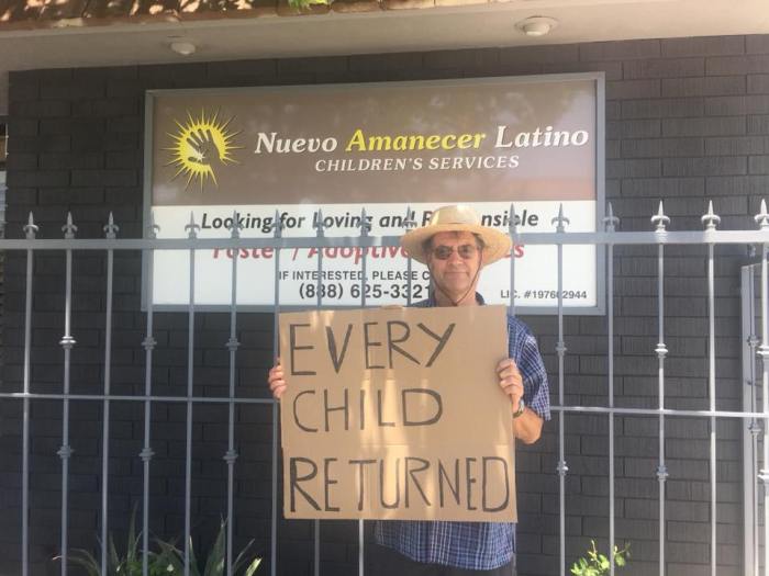 This is a moral atrocity. This wrong is being done in my name (as an American), and probably yours too, and it’s just intolerable. Myself and friends and neighbors feel compelled to do whatever we can to reverse and heal this atrocity. A friend named Rain Perry, who lost her mother at a young age, launched a website — called Every Child Returned, which depends on reputable reporting from the likes of ProPublica — to reverse it. Here I am protesting Tuesday outside a building in San Fernando belonging to a child-holding agency (though we were told that no children were in this particular center).
