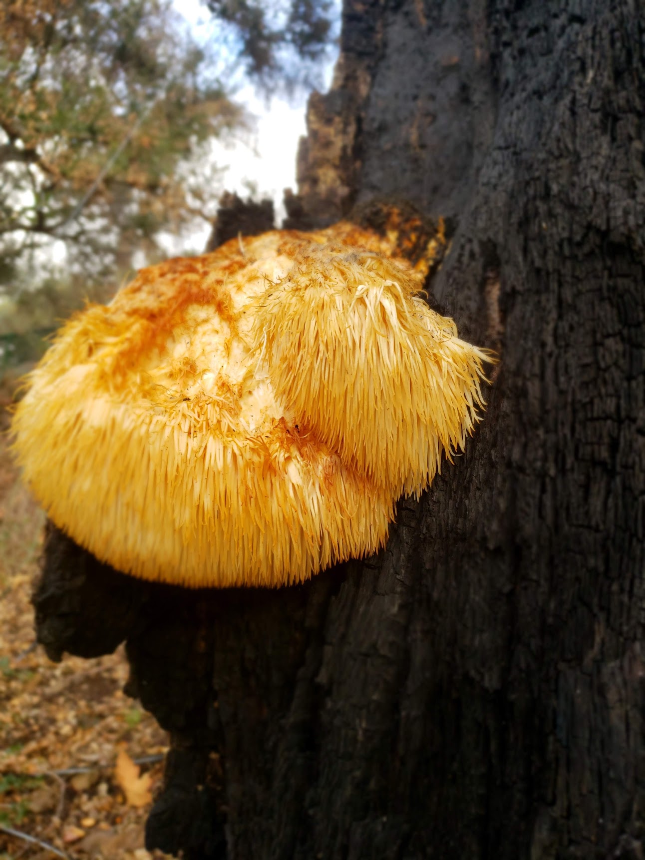 A year later, against odds laid by a couple of local expert tree trimmers, that tree still stands, badly burned, splitting, hazardous to stand under, but undauntedly alive. And directly in the burn this week grew a massive mushroom, of the “lions mane” variety. Amazing and amazingly wild creature.