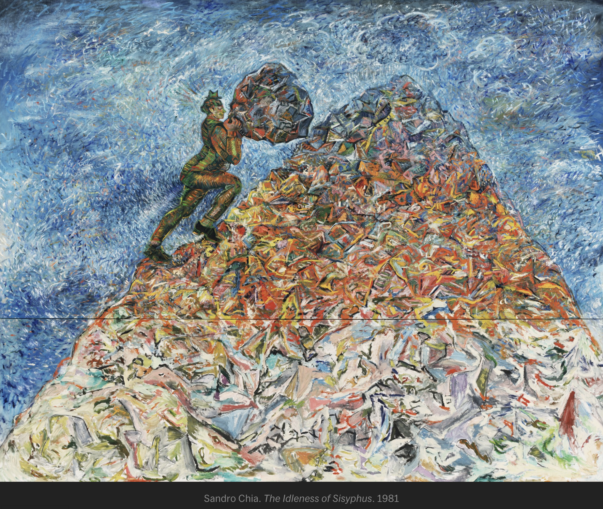 In its think-y way, this example inspires. Of course the struggle seems overwhelming, exhausting, and futile, But seen in a social context, the struggle is what gives our lives meaning. This painting from Sandro Chia, in the Museum of Modern Art, expresses this idea memorably I think: