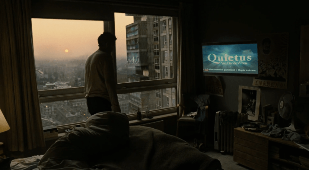 In the movie, we occasionally glimpse and are made aware of by advertising in the story a serenity-inducing product called Quietus, which in time turns out to be a package offering a painless suicide with benefits. A euthanasia for people without much purpose in life, in need of a graceful exit. This is what the ad looks like in the movie, courtesy of scifiinterfaces: