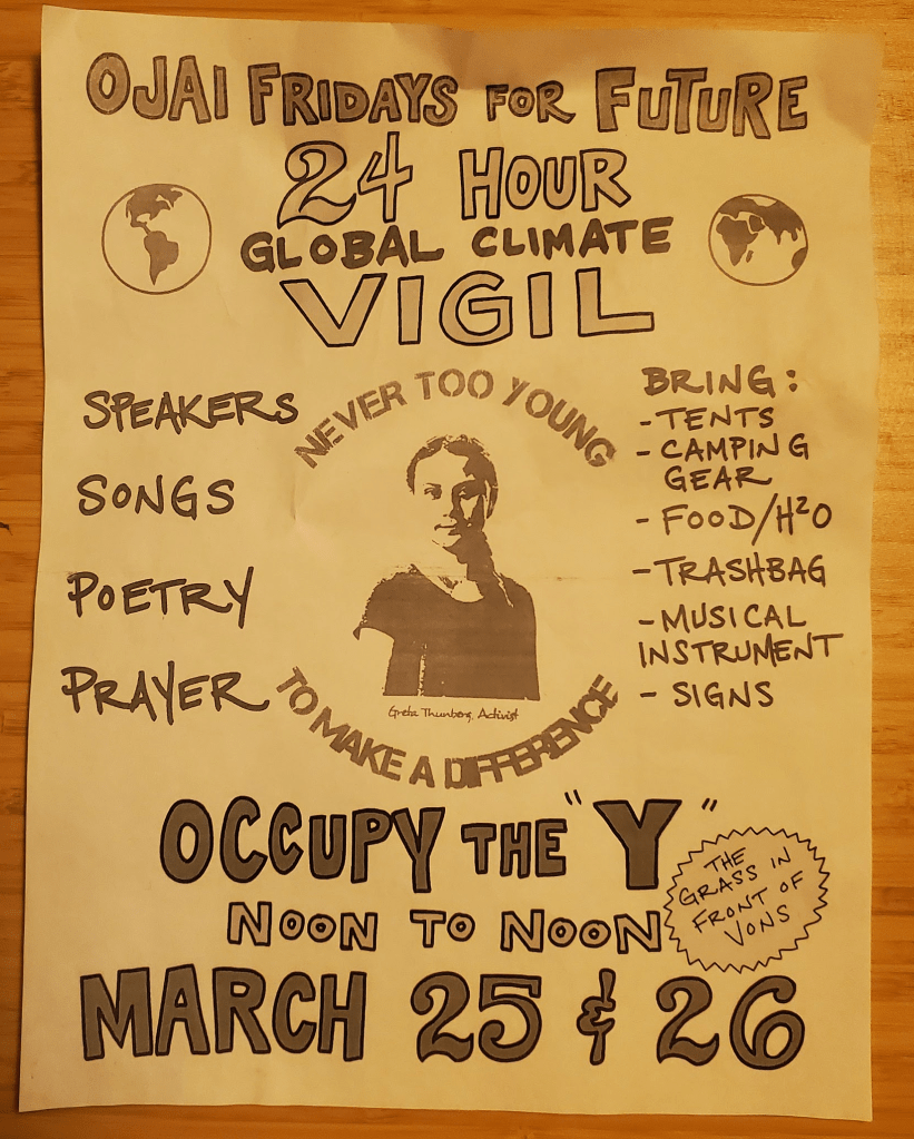 Well, following that path, here in Ojai I will attend a gathering organized by my caring friend Jeff Otterbein and allies from Meiners Oaks, called “Occupy the Y!” A climate action for next weekend the 25th and 26th of March. This means taking residence of a tiny patch of grass near a major intersection, at a crossroads of two small state highways, to inspire action, with speeches, music, poetry, and camping.